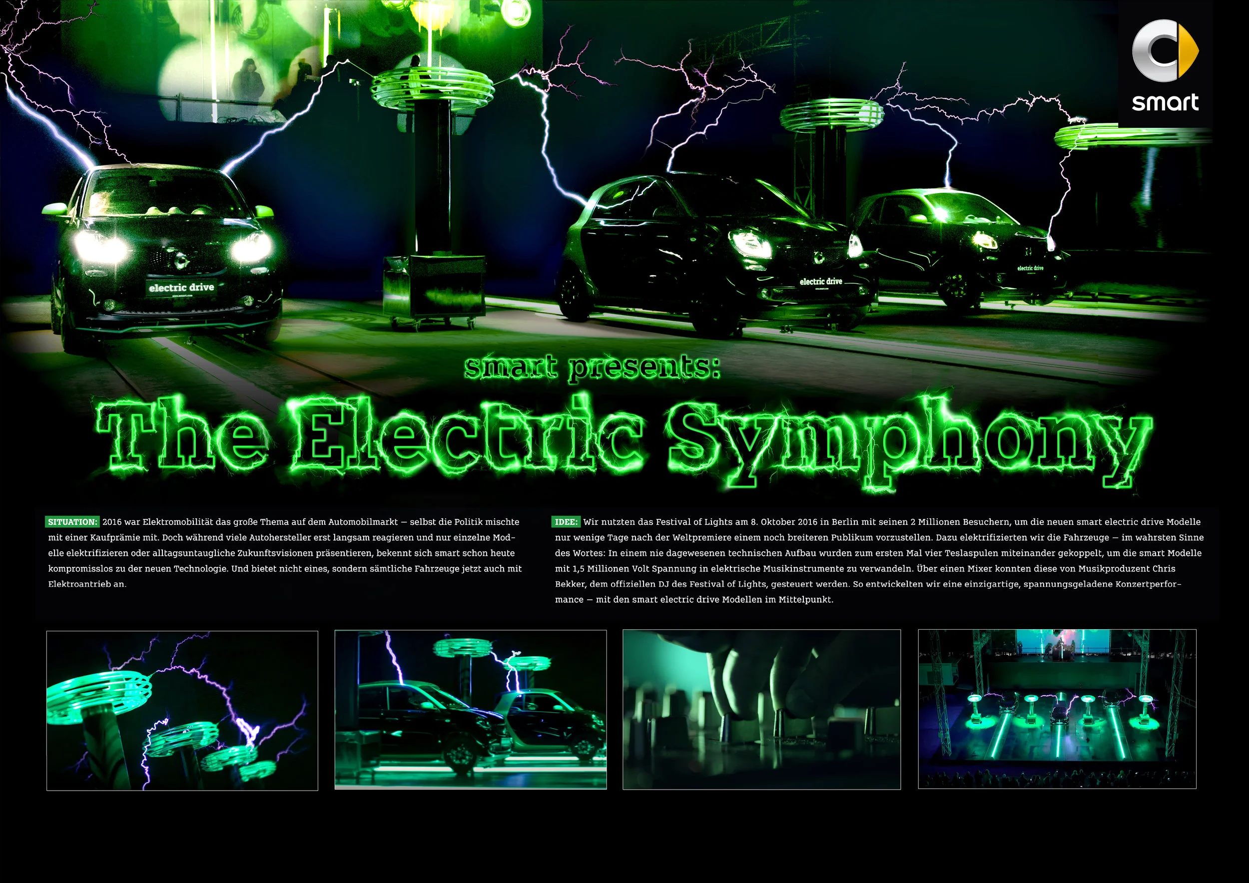 Im Vorfeld der Neueinführung der neuen smart electric drive Modelle entwickelten wir eine ganz besondere Art der Kommunikation. Wir stellten die neuen smart electric drive Modelle im Rahmen des Festivals of Light in einer noch die da gewesenen Art dar. "Fully electric". Dazu haben wir vier Teslaspulen verknüpft und eine einzigartige Choreographie und einen einzigartigen Sound erschaffen wobei die smart als elektronische Instrumente fungierten. Die komplette Performance sehen sie hier: https://www.youtube.com/watch?v=bGO-n1UeJIs