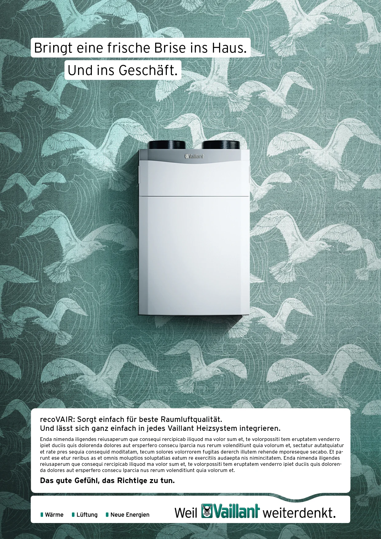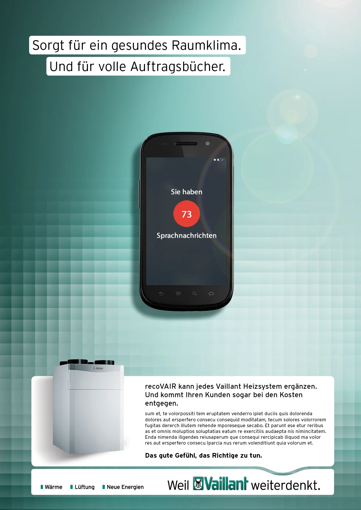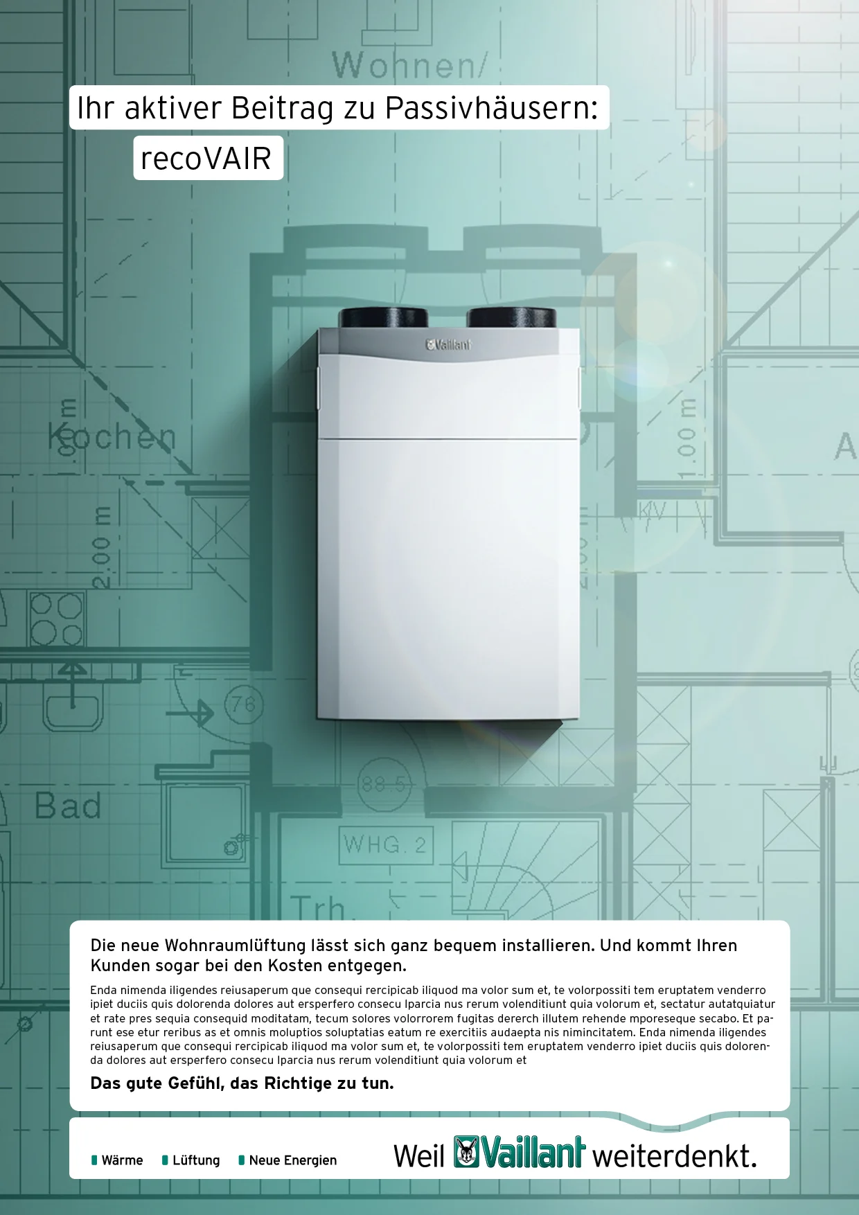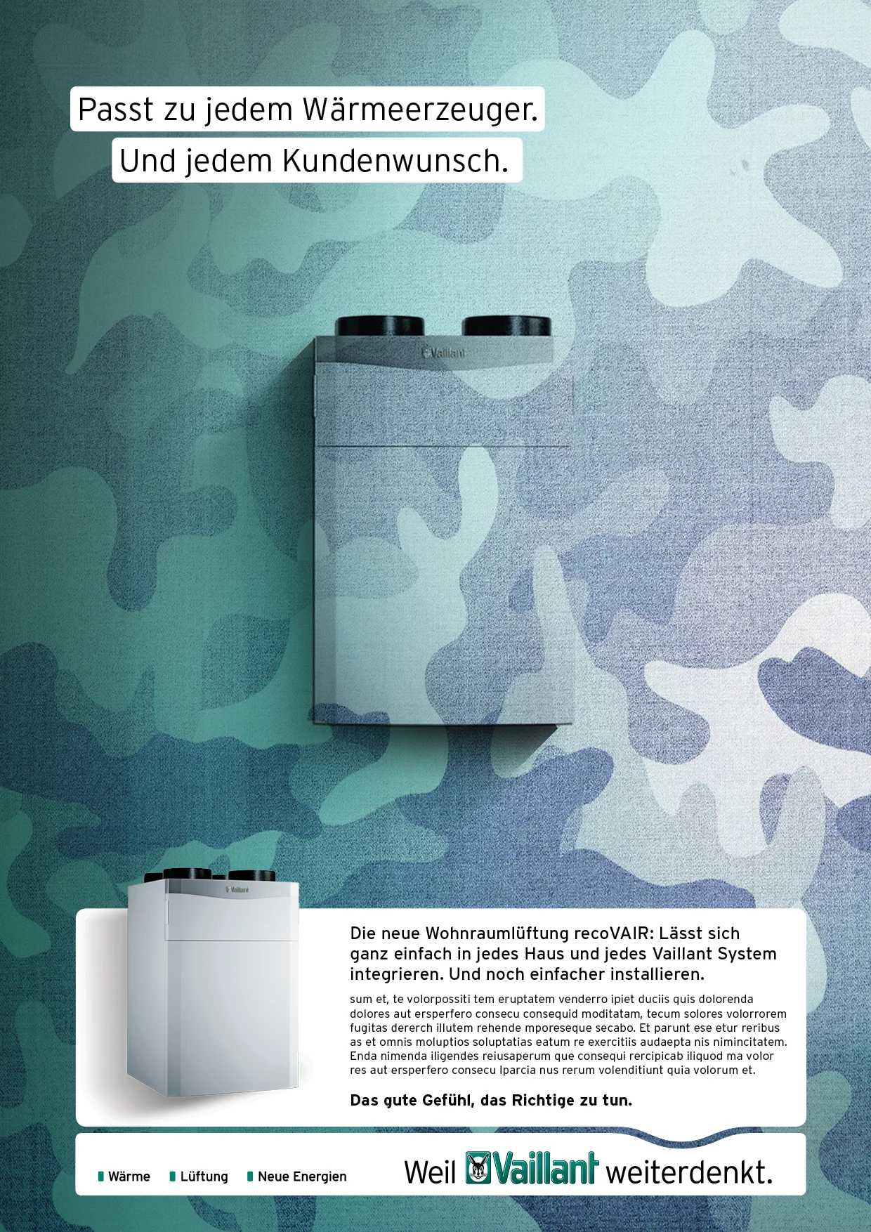Um den Nutzen der Vaillant-Produkte für den Installateur und dem Endverbraucher zu zeigen entwickelten wir eine vergleichsweise emotionale und Design geprägte Produkt-Kampagne unter dem neuen Kampagnen-Satz "Das gute Gefühl das richtige zu tun".