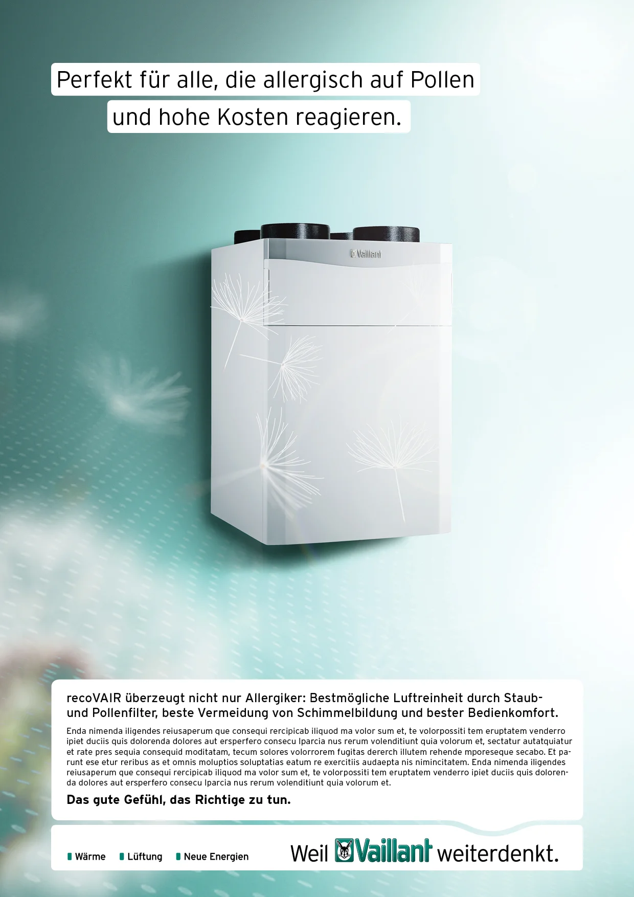 To show the advantages of Vaillant product for plumbers and customers we developed an emotional and design based product-campaign that fits to their new tagline „The good feeling of doing the right thing".