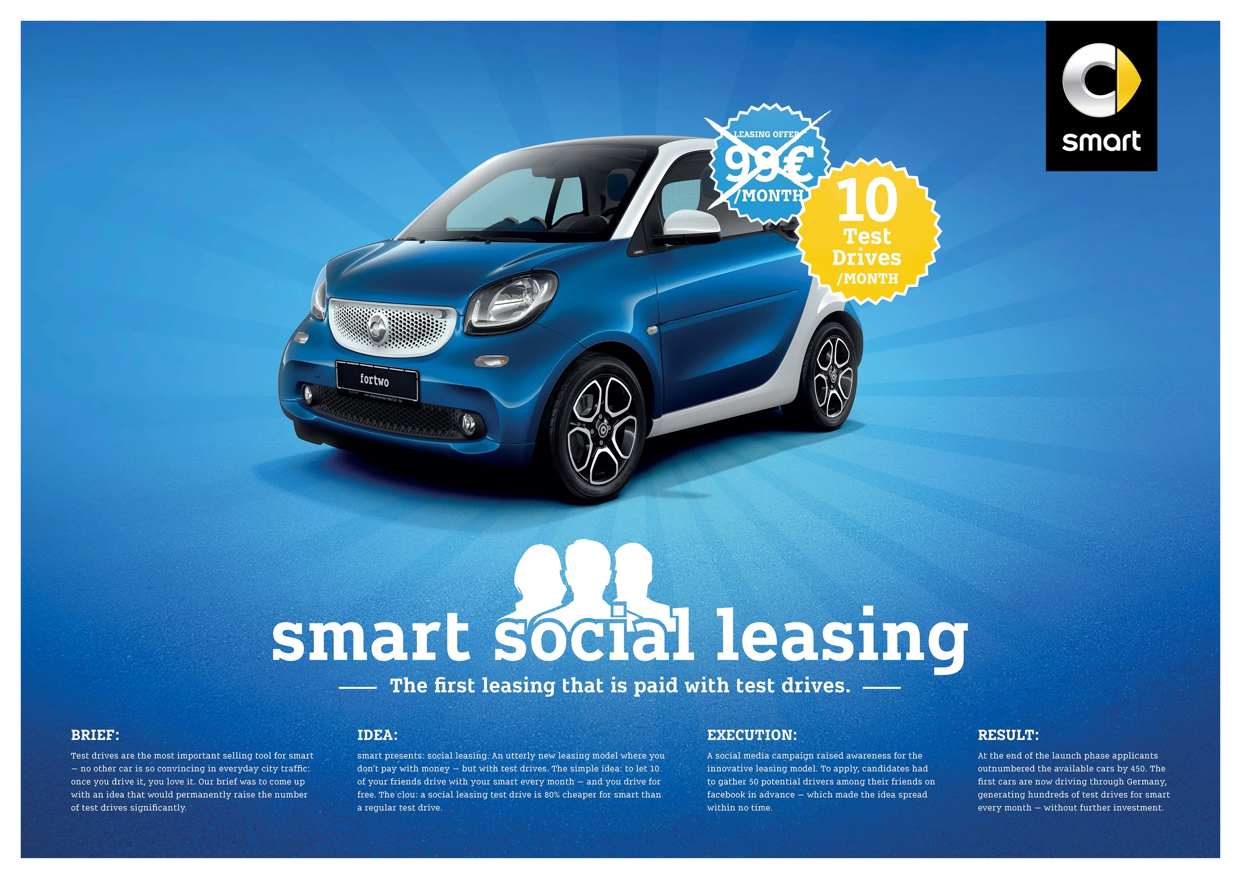 Für smart haben wir ein völlig neues Leasing-Modell entwickelt, bei dem man nicht mit Geld bezahlt – sondern mit Probefahrten. Wer pro Monat 10 seiner Freunde mit seinem smart fahren lässt, fährt umsonst. In einer Medien übergreifenden Kampagne haben wir auf das neue Leasing Modell aufmerksam gemacht. Für die smart social media Kanäle haben wir die gesamte Aktion begleitet und die Gewinner vorgestellt.
